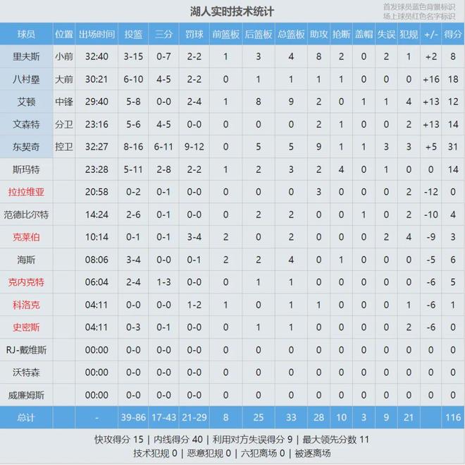 斯玛特防守端可圈可点,不仅贡献4记抢断,而且多次飞扑救球。第四节后半段,两队逐渐换上纯替补。末节最后8.4秒,克内克特三分飙进,湖人追至116-116平。1.4秒国王前场底线发球,裁判吹了湖人防守犯规,比赛仅剩0.8秒。