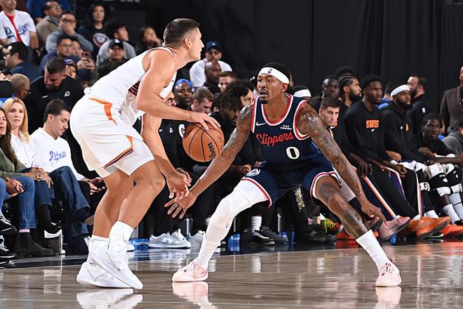 本场比赛中,虽然快船取得了一场大胜,但是球队的先发后场新援布拉德利-比尔(Bradley Beal)面对着自己上赛季效力的老东家太阳的表现只能算是马马虎虎。比尔全场出场20分06秒,投篮4中2,罚球2中2,得到了6分1篮板2助攻的数据,还有1次失误和1次犯规,正负值为+2。比尔在进攻端还是展现出了一定的得分能力,他在传导球方面其实也是能够起到一定的效果的。只是问题就在于,他实在是没有得到足够的球权和战术地位,他在很多时候只能蹲在底角等待机会,这样的战术安排也没有办法使得他全面的得分能力发挥出来。比尔在防守端其实还是比较积极的,并且也是展现出了一定的个人防守能力的。比尔在攻防两端的表现其实都不算糟糕,他的状态并不差,他的比赛态度也是相当积极的。只是受制于球队的战术安排,他确实是没有办法打出更好的表现。